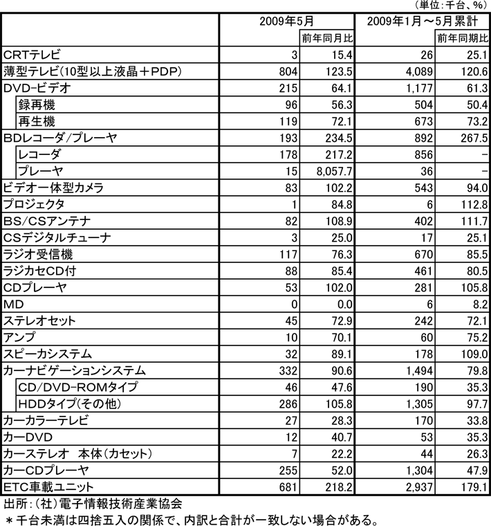 > 統計資料 > 民生用電子機器国内出荷統計 > 2009年