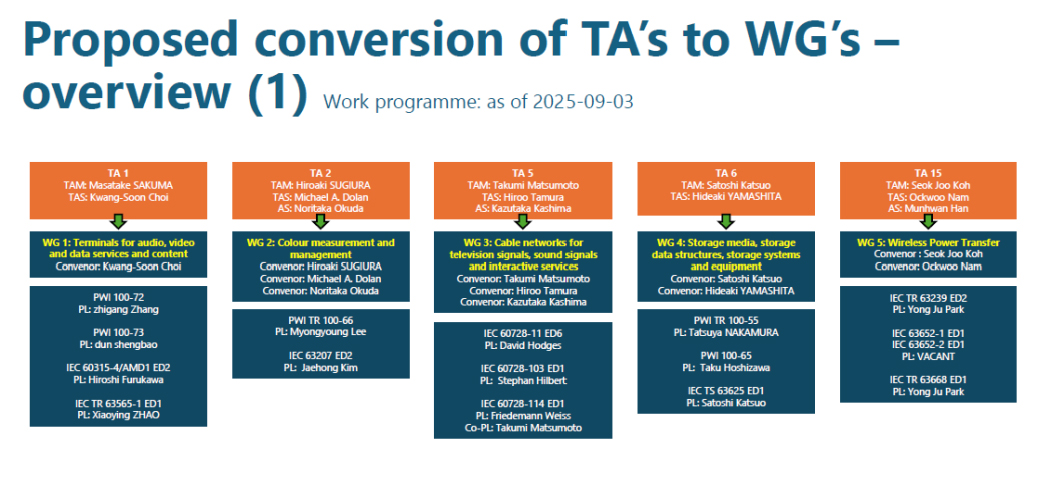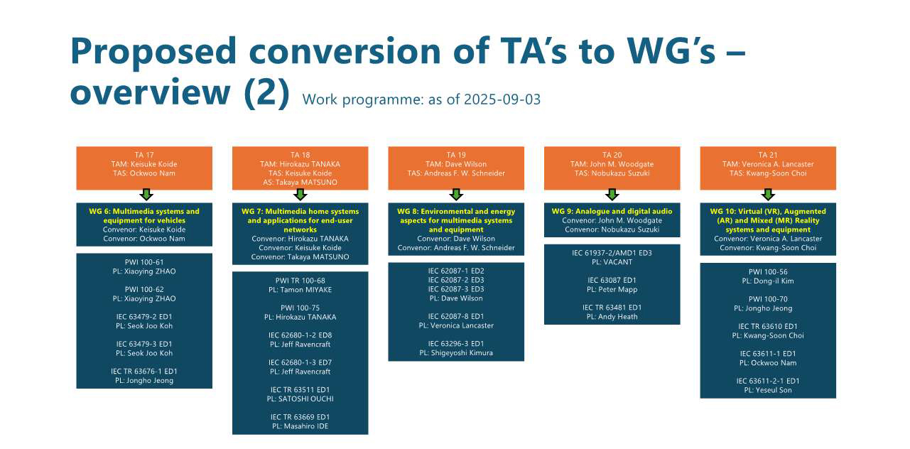 TC100(オーディオ・ビデオ・マルチメディアシステムおよび機器の技術分野に関連する国際標準):1995年10月に設立-2004年1月より日本が幹事国を務めており、国際幹事:上原まひる氏(ソニーグループ)、国際副幹事:佐久間正剛氏(東芝、2025年12月末日まで)、田中宏典氏(パナソニックホールディングス)、Pメンバー(投票権を持つ国):19カ国、Oメンバー(オブザーバーの国):26カ国、傘下に12のWG(Working