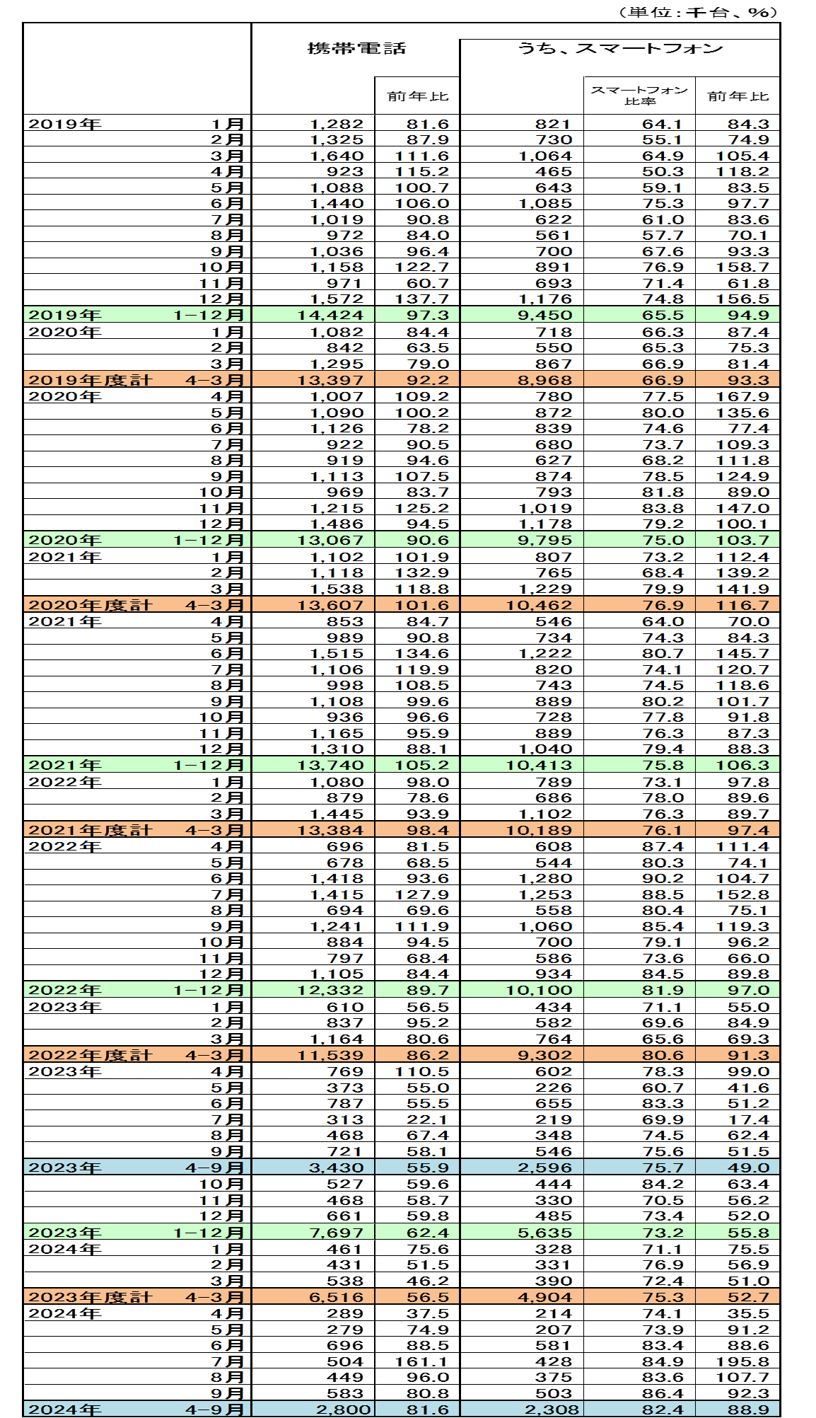 2024年9月の携帯電話国内出荷台数は583千台、前年同月比80.8%となった。うち、スマートフォンは503千台、同比92.3%となった。またスマートフォン比率は86.4%となった。 2024年上半期(4-9月)の携帯電話国内出荷台数は2,800千台、前年比81.6%となった。うち、スマートフォンは2,308千台、同比88.9%となった。また2024年上半期(4-9月)のスマートフォン比率は82.4%となった。 ※携帯電話統計の月次公表は2011年4月実績分より、 一般社団法人 情報通信ネットワーク産業協会(CIAJ)との連名にて行っている。 ※単位未満四捨五入により内訳と合計が一致しない場合がある。 |