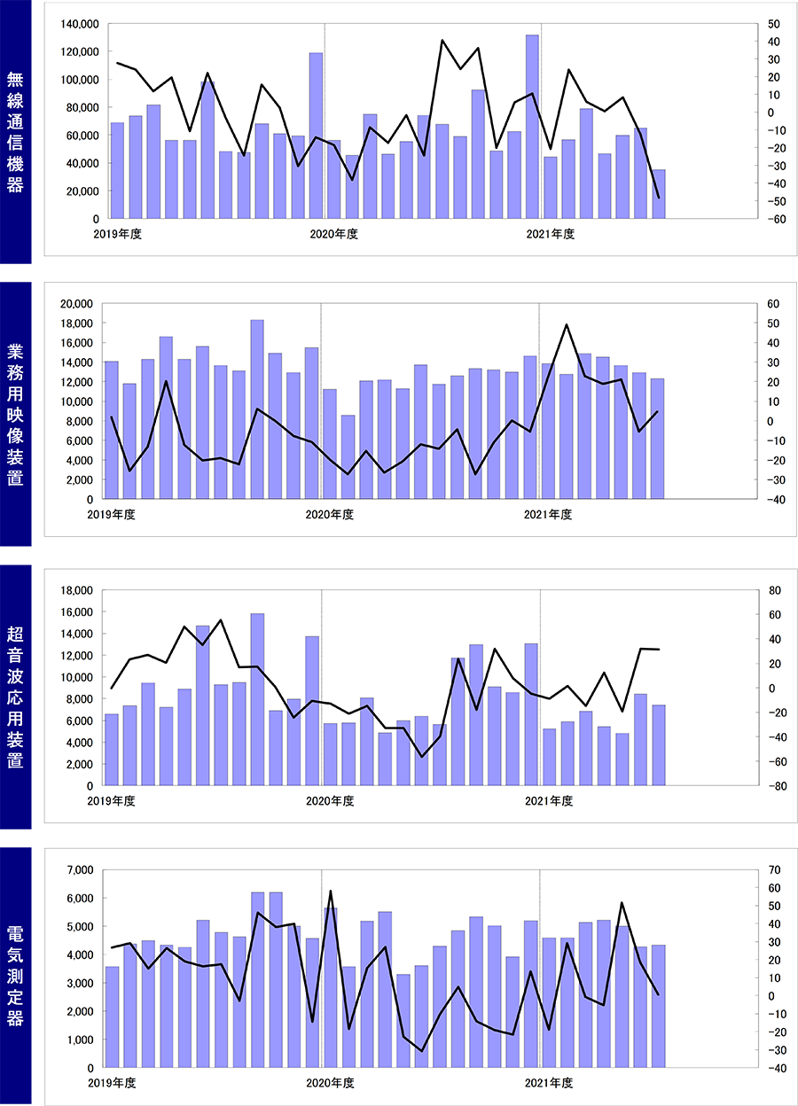 ①無線通信機器は、受注計で、前年同月比48.0%減の350億83百万円となった。 うち、放送装置43億79百万円(同1.3%増)、固定通信装置71億42百万円(同35.7%減)、基地局通信装置32億75百万円(同80.3%減)、移動局通信装置128億6百万円(同39.6%減)、無線応用装置74億81百万円(同47.6%減)となった。 ②業務用映像装置は、受注計で、前年同月比4.8%増の122億86百万円となった。 ③超音波応用装置は、受注計で、前年同月比31.4%増の73億85百万円となった。 ④電気測定器は、受注計で、前年同月比0.6%増の43億23百万円となった。 【TOPICS】 (1)固定通信装置では、衛星系通信装置の内需が前年同月比37.0%減少し、固定通信装置で同35.7%減少となった。 (2)移動局通信装置では、携帯電話の内需が前年同月比39.1%減少し、移動局通信装置で同39.6%減少となった。 |