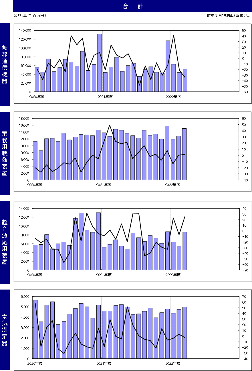 ①無線通信機器は、受注計で、前年同月比34.1%減の519億96百万円となった。 うち、放送装置51億61百万円(同15.0%増)、固定通信装置138億24百万円(同69.2%増)、基地局通信装置55億70百万円(同64.6%減)、移動局通信装置198億85百万円(同34.9%減)、無線応用装置75億56百万円(同62.2%減)となった。 ②業務用映像装置は、受注計で、前年同月比1.4%増の150億61百万円となった。 ③超音波応用装置は、受注計で、前年同月比25.3%増の86億円となった。 ④電気測定器は、受注計で、前年同月比2.5%減の49億95百万円となった。 【TOPICS】 (1)移動局通信装置では、携帯電話の内需が前年同月比461.%減少し、移動局通信装置で同34.9%減少となった。 (2)無線応用装置では、レーダの内需が前年同月比84.3%減少し、無線応用装置で同62.2%減少となった。 |