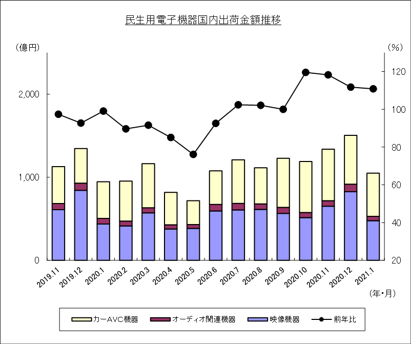 ※ 2020年4月より、カーAVC機器にドライブレコーダを追加、また統計参加会社の変更があったため、民生機器計、カーAVC機器の前年比は参考値。
