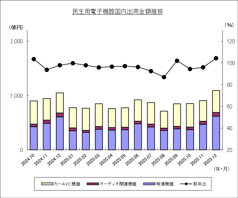 民生用電子機器の12月国内出荷金額は1,094億円(前年比104.4%)となった。